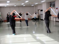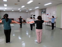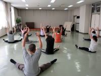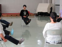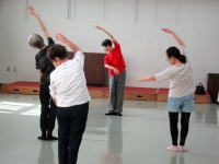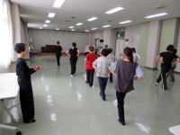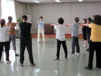 体のひねり、足の運び方、股関節を伸ばす、手首や指の動き、リズムに合わせた足踏み、タオルを使った動き等、多岐に渡り教えていただきました。皆さん軽く汗も出て、心地よさそうでした。 |