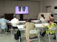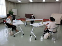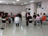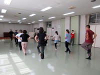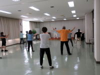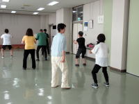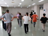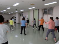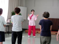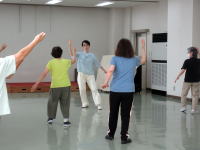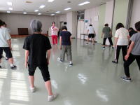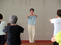 軽い準備運動から始め、歩き方・足踏み・手先を動かす等、参加者のレベルに合わせ優しく丁寧に教えていただきました。特に足の動きは椅子に座って行うなど身体に負担なく行えました。 しかし、みなさん冷房の効いた部屋の中でも軽く汗が出るのは、しっかり身体を動かしている証拠のようです。 |