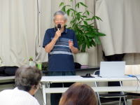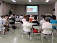 今回は、介護予防に関する観点から「音楽のたまてばこ」と題して、音楽療法士の濱島須美子さんとピアノ演奏者の永井夕貴さんを講師にお願いしました。 自宅でできる嚥下(えんげ)リハビリとして、顔・首・口のマッサージ、肩や首のストレッチ、早口言葉、、口の体操、歌を歌うことを判りやすく教えていただきました。 また、後半では脳トレで動きを加え歌うなど自宅に帰っても気軽に体を動かせる内容でした。 暑い日が続きますが、参加された皆さんはリラックス出来たかと思います。 |